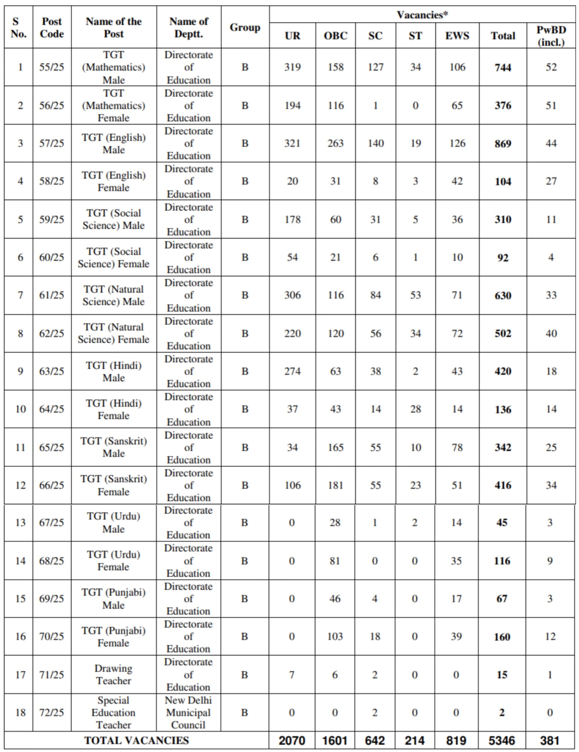 Delhi DSSSB TGT Recruitment 2025 : Vacancy Details Total Post 5346 |